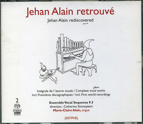 L'organiste Marie-Claire Alain, soeur de Jehan, ne semble pas avoir beaucoup d'amis sur ce forum (j'ai par elle des enregistrements d'oeuvres de Buxtehude, J.S. Bach, Franck, Poulenc [le Concerto pour orgue] et Messiaen). Reconnaissons-lui quand même le mérite de bien défendre la musique de son frère. Ce qu'elle fait remarquablement, à mon avis, dans les deux disques (intégrale de l'oeuvre d'orgue) et le double album (intégrale de l'oeuvre vocale, où elle tient aussi bien l'orgue que le piano) ci-dessous, ce dernier ayant été distingué par un "Diapason d'Or" et accueilli avec enthousiasme par la presse à sa sortie en 2005 :